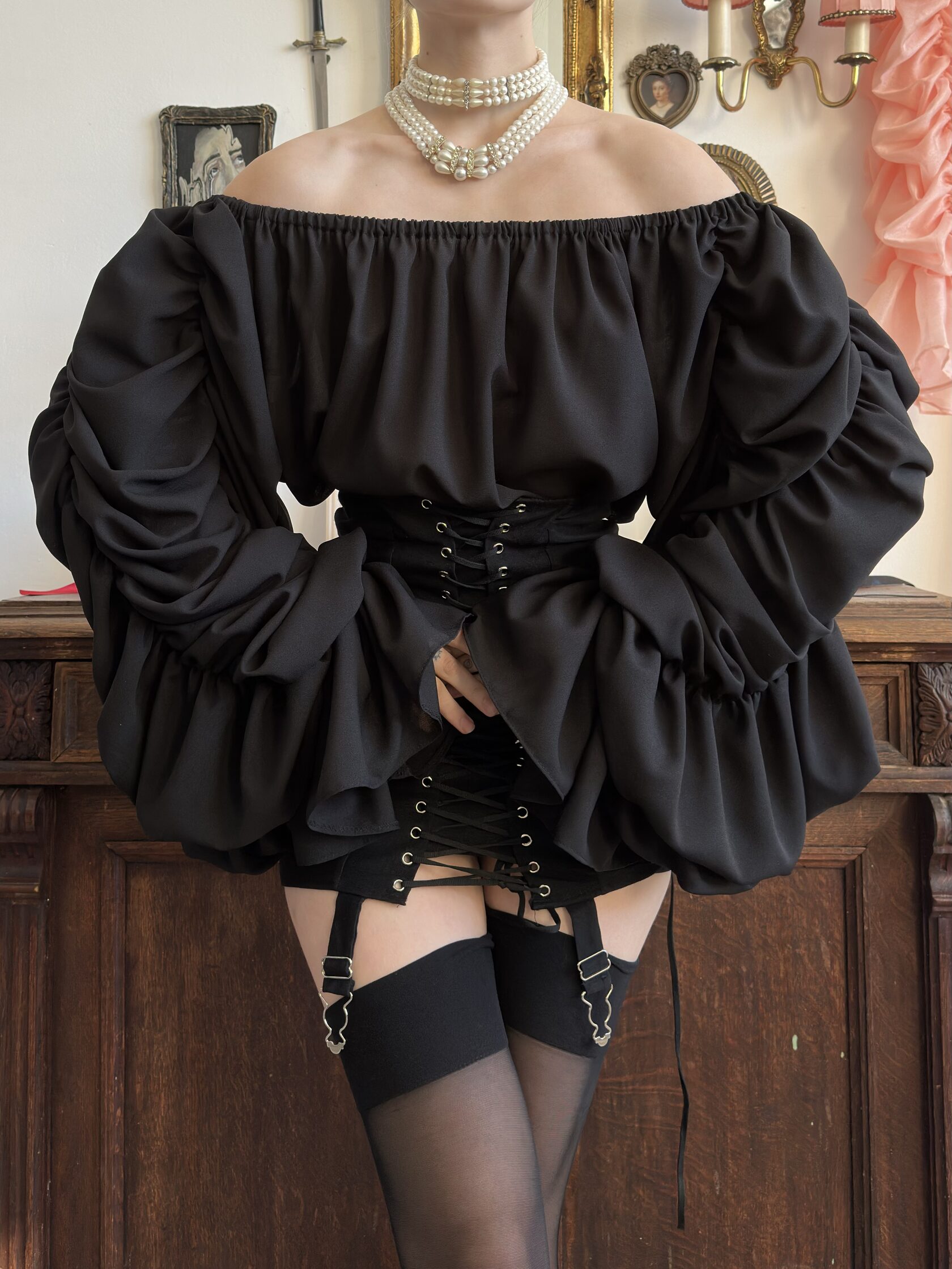 Блуза с воланами и пышными рукавами из легкой вуали. Спереди на блузе есть две завязки