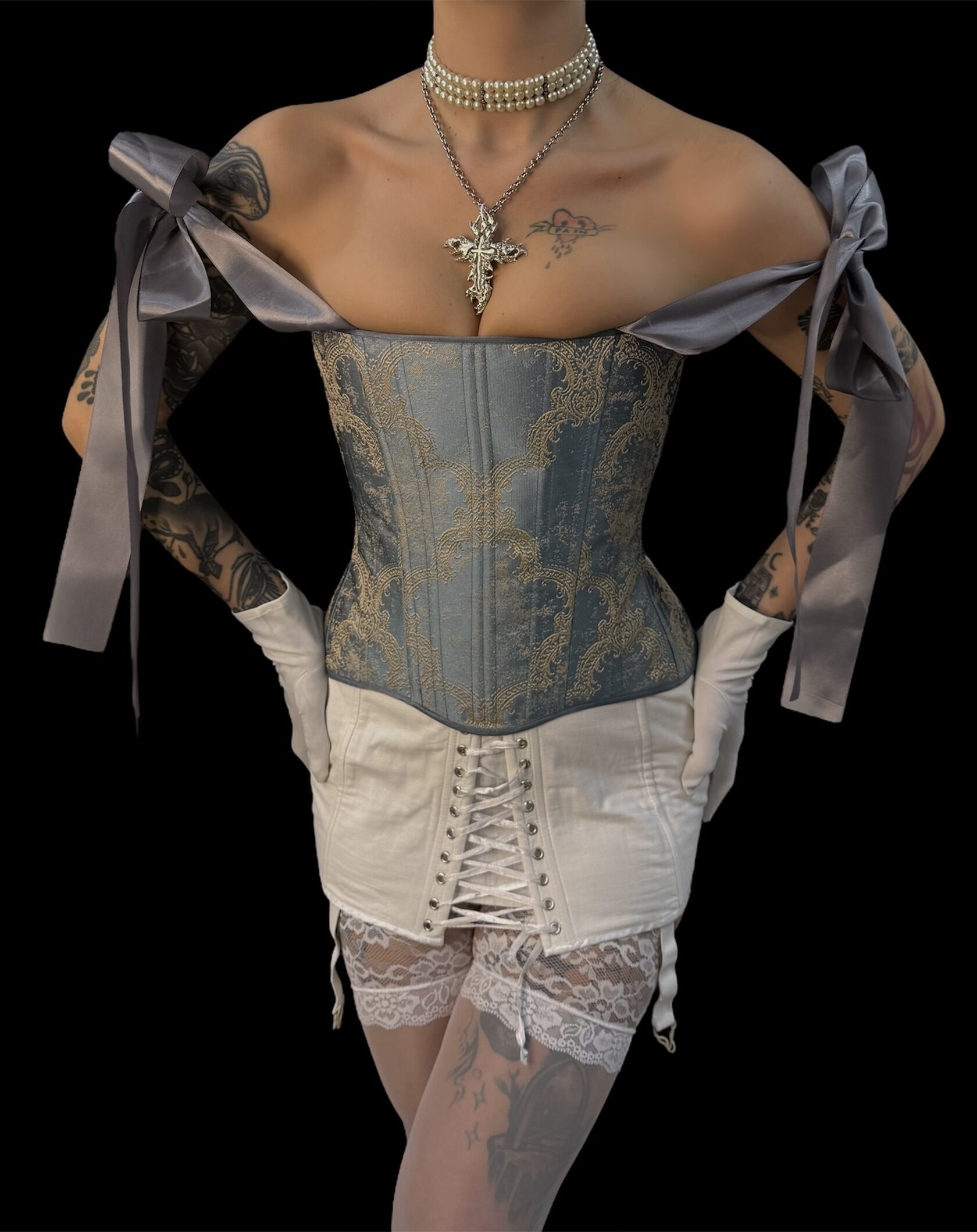 Корсет хорошо держит форму, утягивает. Подойдет для носки, как на голое тело, так и на второй слой. Бретели регулируются лентами или шнурками, что позволяет максимально удобно отрегулировать корсет по вашей фигуре. Спинка также затягивается лентами или шнурками.