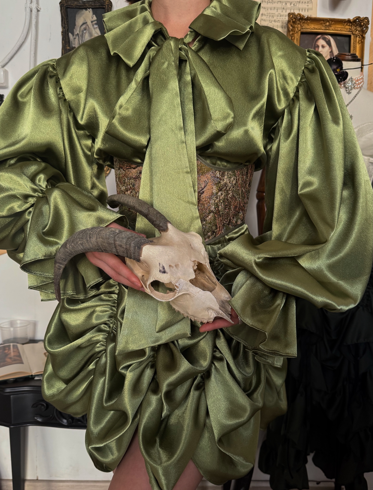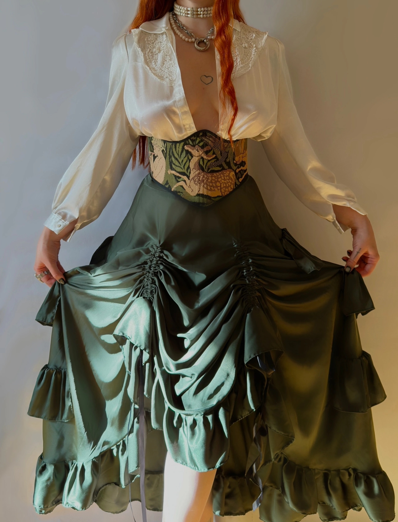 Атласная юбка с кулисками, сзади и по бокам есть ярусы, которые делают юбку объемнее и интереснее